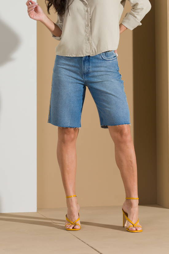 A barra desfiada da bermuda jeans wide é o toque final que garante um visual ainda mais moderno e descontraído. Esse detalhe confere um ar despojado e autêntico à peça, tornando-a perfeita para as mulheres que buscam um estilo único e cheio de personalidade. A combinação da barra desfiada com as correntes cria um contraste perfeito e eleva o visual da bermuda a outro nível.