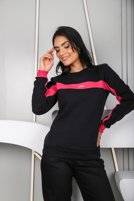 O moletom feminino fechado forro flanelado EDEX entrega visual forte e atual logo no primeiro olhar. A faixa frontal contrastante em rosa destaca o busto e reforça a identidade da marca. Uma blusa feminina moderna, pensada para moda inverno feminina com apelo comercial elevado.