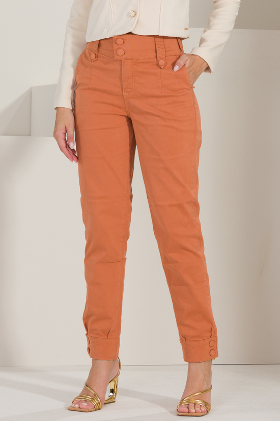 A cor terracota da calça cigarrete, com seu tom entre laranja queimado e marrom, transmite personalidade e originalidade, ao mesmo tempo em que mantém uma aparência elegante. Ela combina muito bem com tons neutros (bege, branco e preto) e até com outras cores mais vibrantes, como o verde ou azul-marinho.
