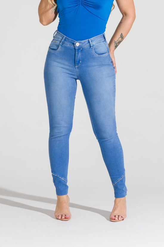 A Calça Feminina Jeans Cigarrete Modeladora é uma ótima opção para o dia a dia sendo que, sua modelagem tem todo o conforto necessário para um dia inteiro. Uma calça prática e básica com um detalhe em strass de brilhos na barra da calça, que contrasta a peça trazendo um ar sofisticado e feminino ao visual.
