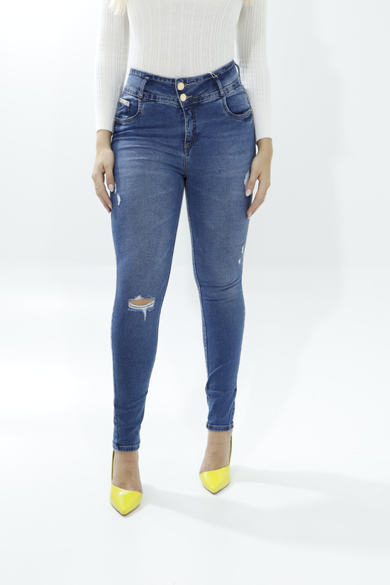 Um dos pontos mais notáveis do design são os dois botões dourados duplos na cintura, que se destacam com o azul do jeans. Esses botões, além de seu papel funcional, servem como um elemento decorativo proeminente, elevando o visual da peça. A cintura alta, que abraça a região abdominal, é valorizada por essas aplicações e tem um corte em “V” sutil na parte central, o que pode contribuir para um ajuste mais confortável e estético.