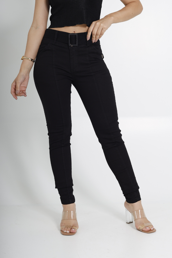 Um dos destaques da calça são as costuras verticais que percorrem a parte frontal de cada perna, que ajudam a alongar visualmente a silhueta. A peça possui um cós alto, que se ajusta bem à cintura, e um cinto embutido, na mesma tonalidade preta, com uma fivela quadrada também preta e discreta. Este detalhe adiciona um toque moderno e funcional ao design da calça.