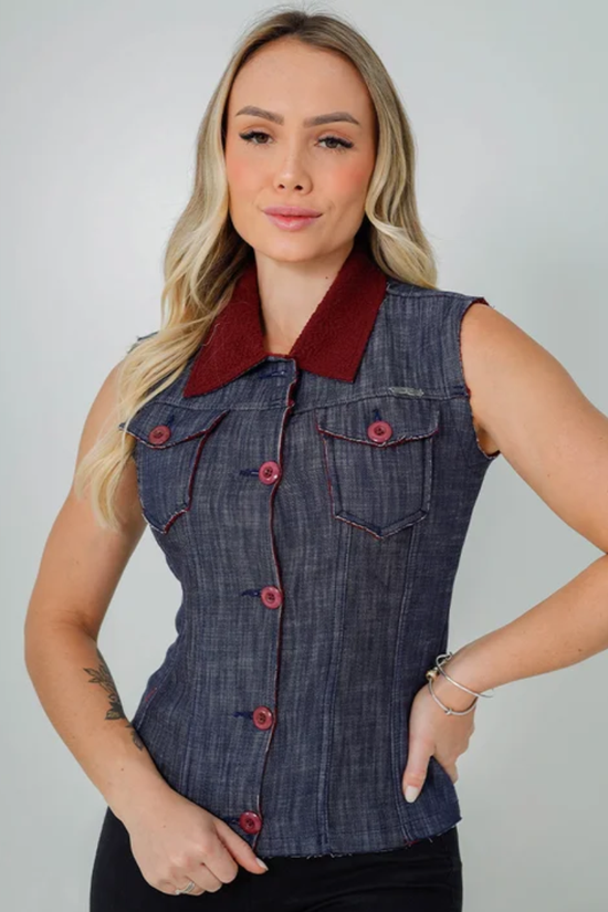 Além da beleza, o Colete Feminino Jeans possui bolsos na parte da frente, que não só trazem um destaque à peça, como são totalmente utilitários e práticos para o dia a dia. Com uma lavagem tradicional, o Colete também conta com os botões, a gola, e alguns acabamentos em vermelho, que contrastam o azul predominante da peça, trazendo um visual cheio de personalidade.