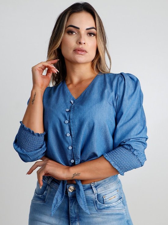 Peça na cor azul, modelo de amarraçăo com manga longa esilo balăo e decote em V, punho com detalhe em elástico com efeito franzido, dando um toque de sofisticaçăo.