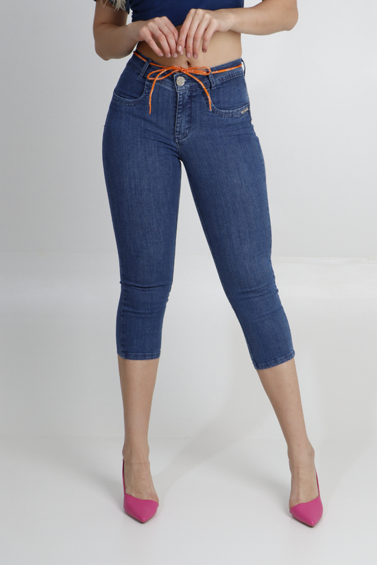 A Calça Feminina Jeans Capri Cordão Laranja une estilo atual e feminilidade.