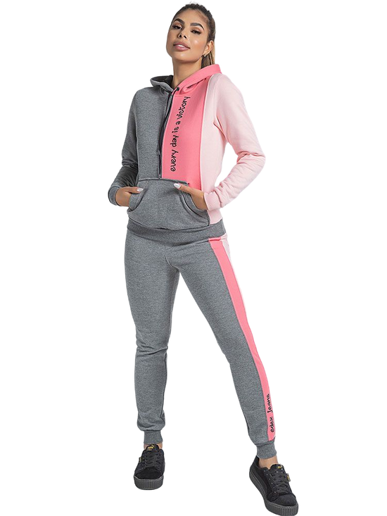 Peça na cor mescla com rosa, punho e barra com elástico, blusa conta com capuz com cordão, e bolso canguru, possui recortes na parte frontal em cores contrastantes, e estampa personalizada, a calça possui dois bolsos frontais, e conta com listras na lateral, dando um toque de sofisticação.